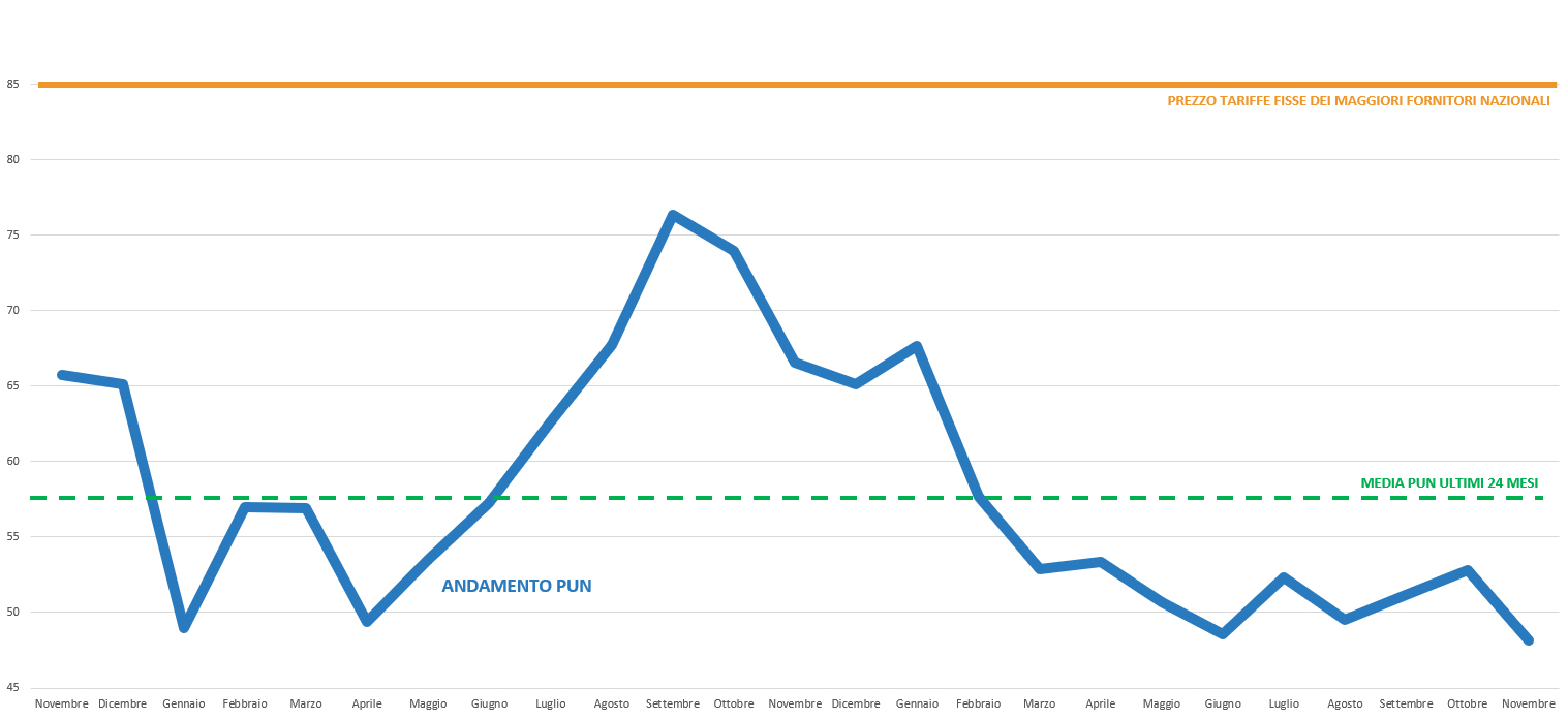 Il PUN (Prezzo Unico Nazionale) definisce proprio la media di tutti i prezzi di vendita zonali, pesata con gli acquisti totali di energia. Esso è quindi un valore di riferimento dell’energia elettrica acquistata in borsa in tutta Italia.